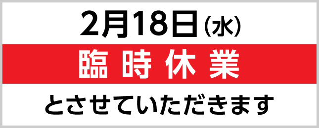 社内行事のため2026年2月18日(水)は臨時休業とさせていただきます。お客様にはご不便をおかけして申し訳ありませんが何卒ご了承をお願い申し上げます。